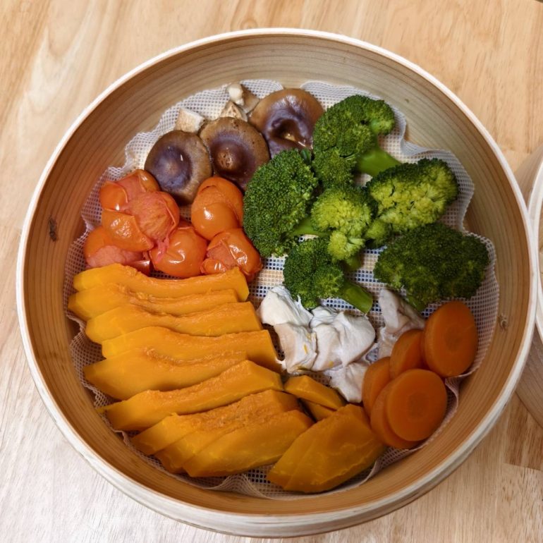 他にも、冷凍ご飯と生卵を野菜とお肉を一緒に蒸したり、レトルトカレーのパウチそのままと余り野菜とご飯を一緒に蒸したりもできるみたいで、平日のひとりお昼ご飯にも活躍しそうです。